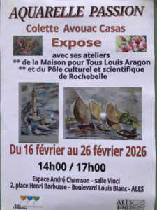 Exposition Aquarellepassion avec ses ateliers de la Maison pour tous des Cévennes et du Pôle culturel de rochebelle espace André Chamson 30100 ALES du 26 Mars au 05 Avril 2024